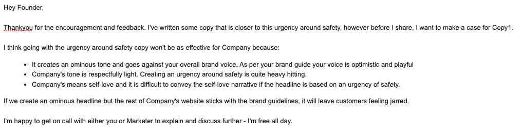 It turns out that pushing back and disagreeing with a clientâs feedback comes with the copywriting job.